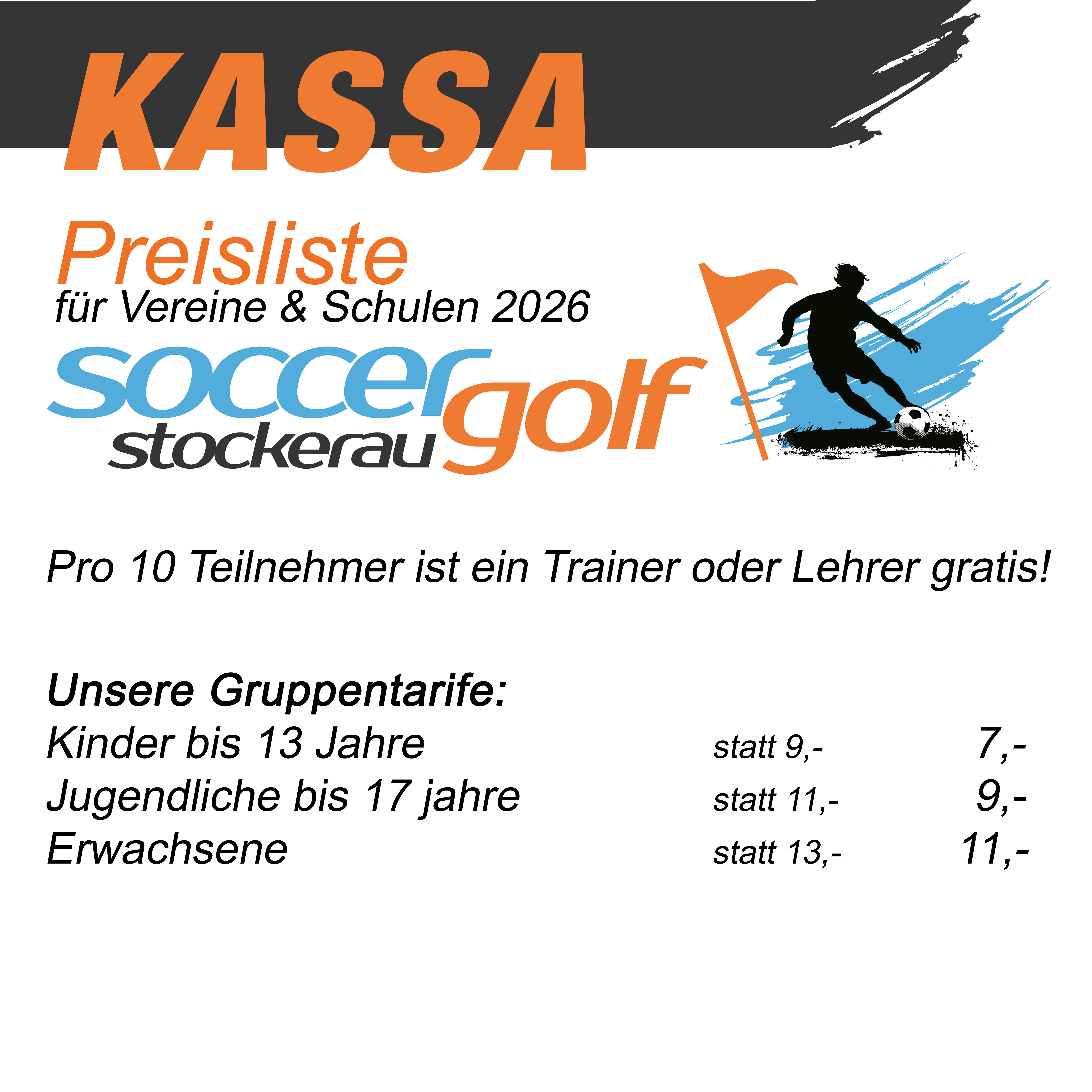 Tragen Sie die Kleidung, mit der Sie sich wohlfühlen. Ideal sind Sportschuhe, aber bitte keine Noppen- oder Golfschuhe mit Spikes. Fußbälle können Sie entweder kostenlos bei uns gegen Pfand ausleihen oder Sie bringen Ihre eigenen Bälle mit.